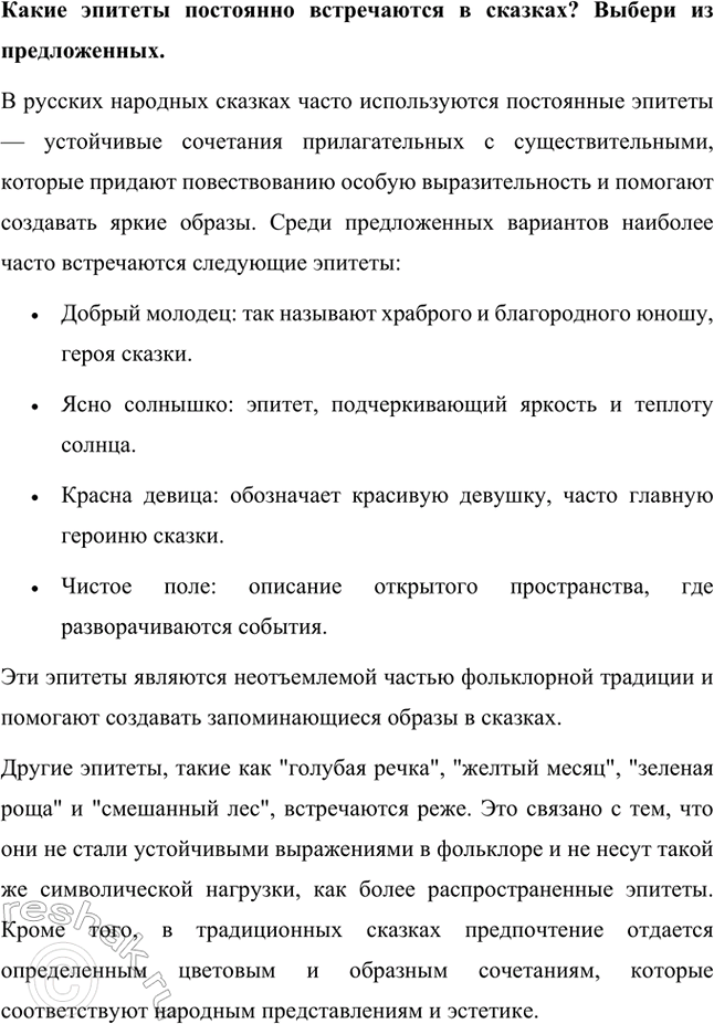 В русских народных сказках часто используются постоянные эпитеты — устойчивые сочетания прилагательных с существительными, которые придают повествованию особую выразительность и помогают создавать яркие образы. Среди предложенных вариантов наиболее часто встречаются следующие эпитеты: