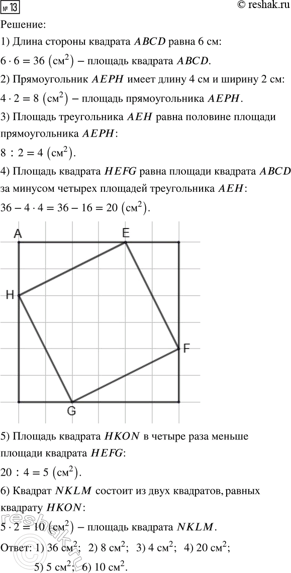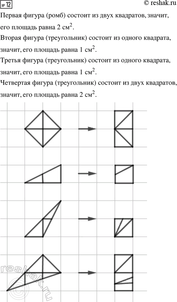 12. Площадь жёлтого квадрата равна 1 см^2. Найди площади остальных фигур.