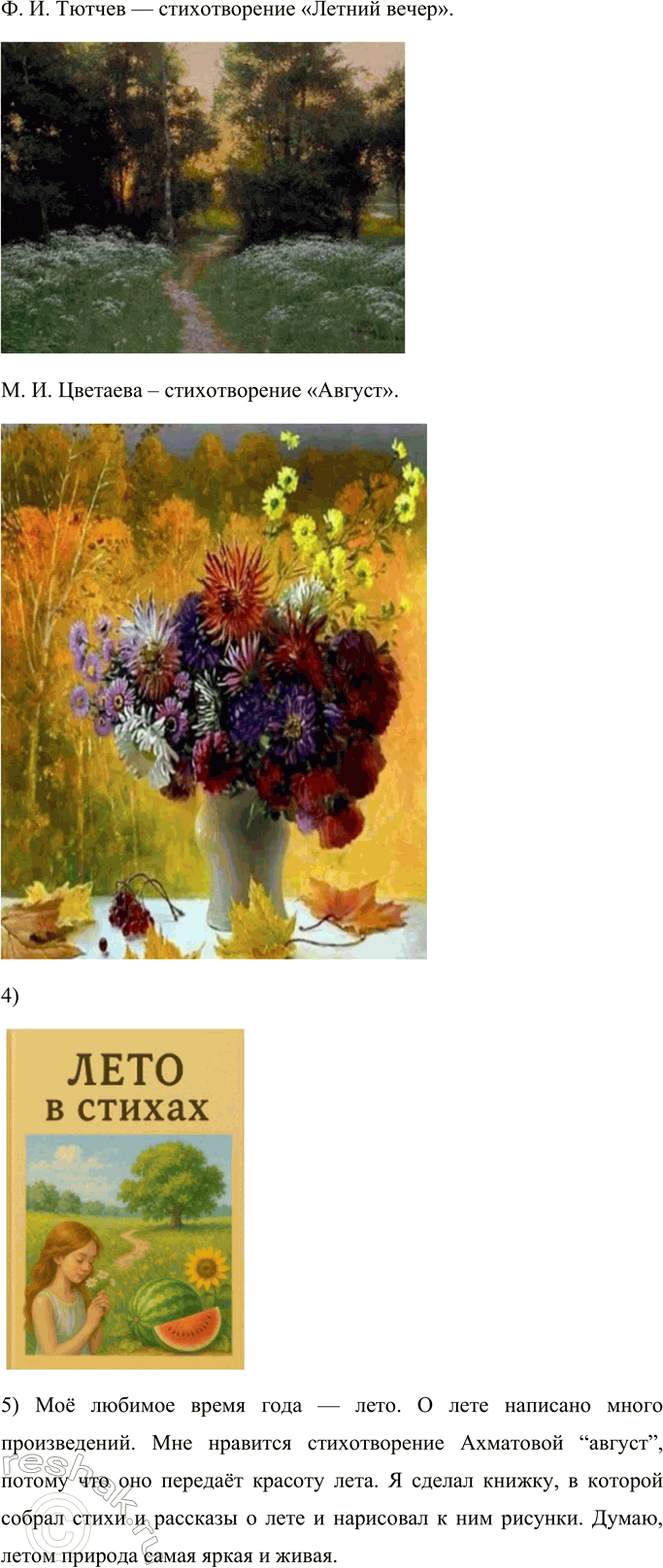 5) Моё любимое время года — лето. О лете написано много произведений. Мне нравится стихотворение Ахматовой “август”, потому что оно передаёт красоту лета. Я сделал книжку, в которой собрал стихи и рассказы о лете и нарисовал к ним рисунки. Думаю, летом природа самая яркая и живая.