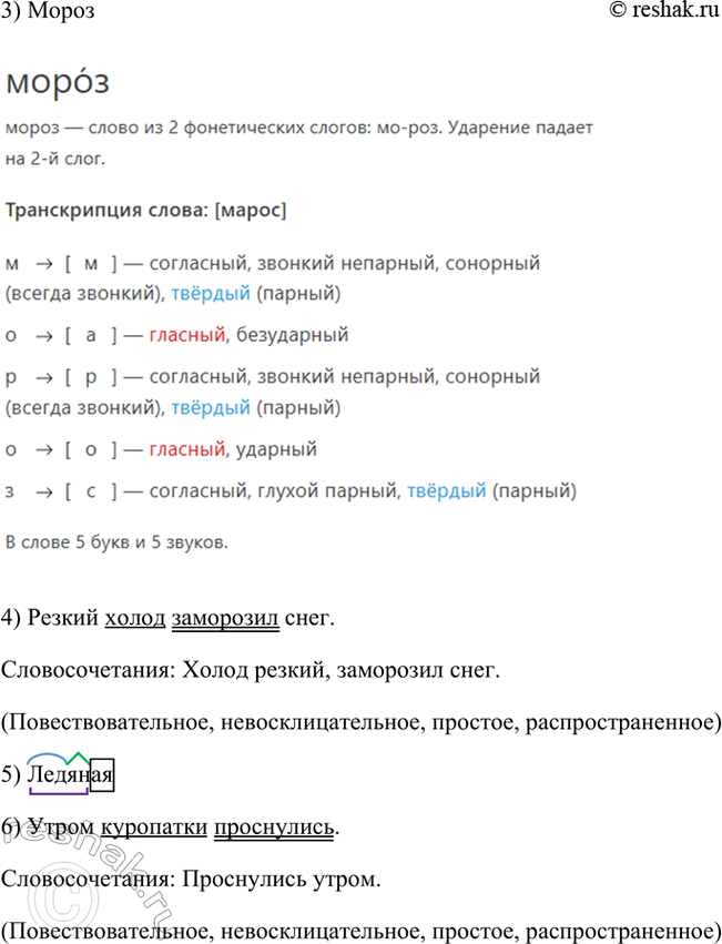 Ночью (разделит. ь) грянул мороз1. Резкий (резок) холод (холодный) заморозил словарное слово) снег.4 Появилась скользкая (скользить) и жёсткая (жёсток) ледяная2 (лёд) корка снега.