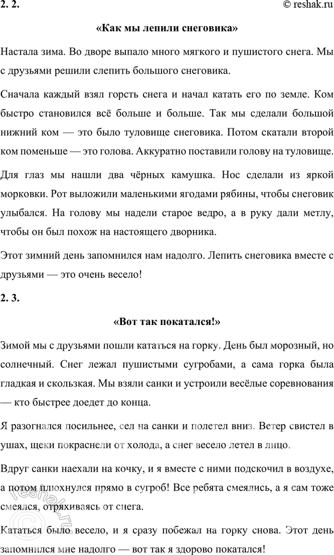 Зимой в нашем городском парке всегда многолюдно. Все любители зимних забав собираются здесь. Ребята привозят с собой санки и катаются с высокой горки. Для тех, кто любит ходить на лыжах, проложена лыжня. Кто-то лепит снеговика, кто-то играет в снежки – любой найдёт себе занятие на прогулке. Хорошо зимой!