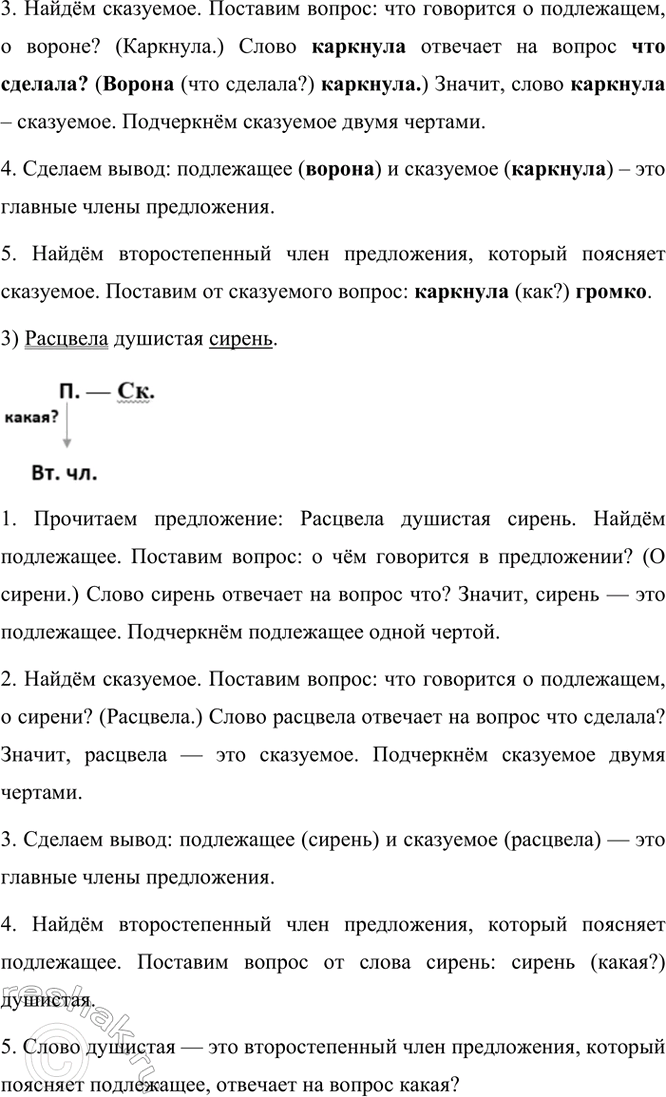 3. Найдём сказуемое. Поставим вопрос: что говорится о подлежащем, о вороне?(Каркнула.) Слово каркнула отвечает на вопрос что сделала?(Ворона (что сделала) каркнула.) Значит, слово каркнула – сказуемое. Подчеркнём сказуемое двумя чертами.
