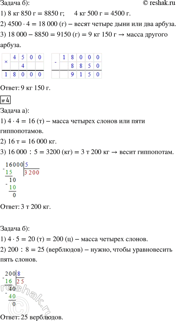 4. а) Четыре слона весят столько же, сколько пять гиппопотамов. Сколько весит гиппопотам, если слон весит 4 т? (Масса всех слонов одинакова и масса всех гиппопотамов тоже.)