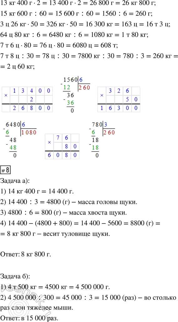 13 кг 400 г · 2 3 ц 26 кг · 50 7 т 6 ц · 80