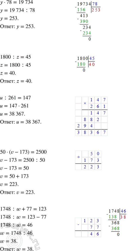 у · 78 = 19 734 u : 261 = 147 1748 : w + 77 = 123