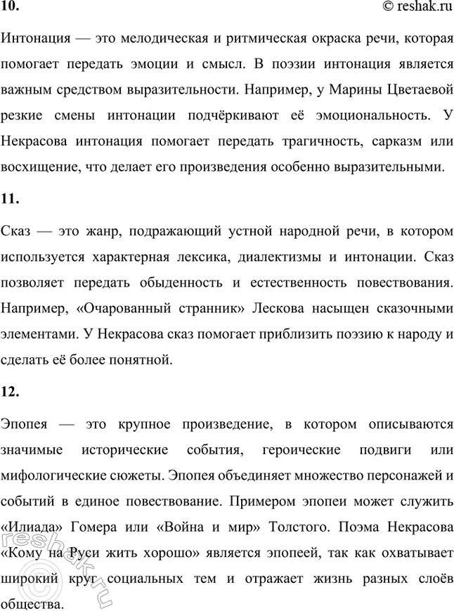Интонация — это мелодическая и ритмическая окраска речи, которая помогает передать эмоции и смысл. В поэзии интонация является важным средством выразительности. Например, у Марины Цветаевой резкие смены интонации подчёркивают её эмоциональность. У Некрасова интонация помогает передать трагичность, сарказм или восхищение, что делает его произведения особенно выразительными.