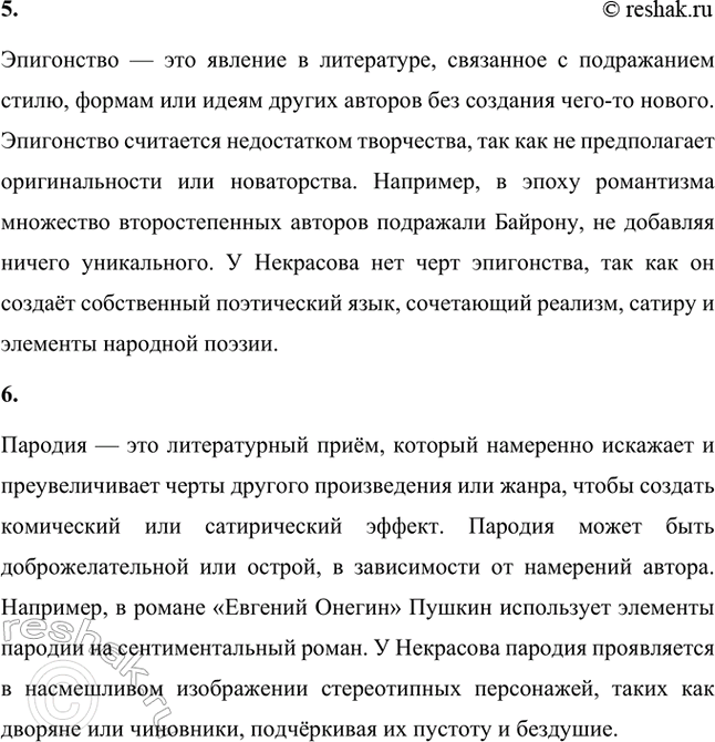 Пародия — это литературный приём, который намеренно искажает и преувеличивает черты другого произведения или жанра, чтобы создать комический или сатирический эффект. Пародия может быть доброжелательной или острой, в зависимости от намерений автора. Например, в романе «Евгений Онегин» Пушкин использует элементы пародии на сентиментальный роман. У Некрасова пародия проявляется в насмешливом изображении стереотипных персонажей, таких как дворяне или чиновники, подчёркивая их пустоту и бездушие.