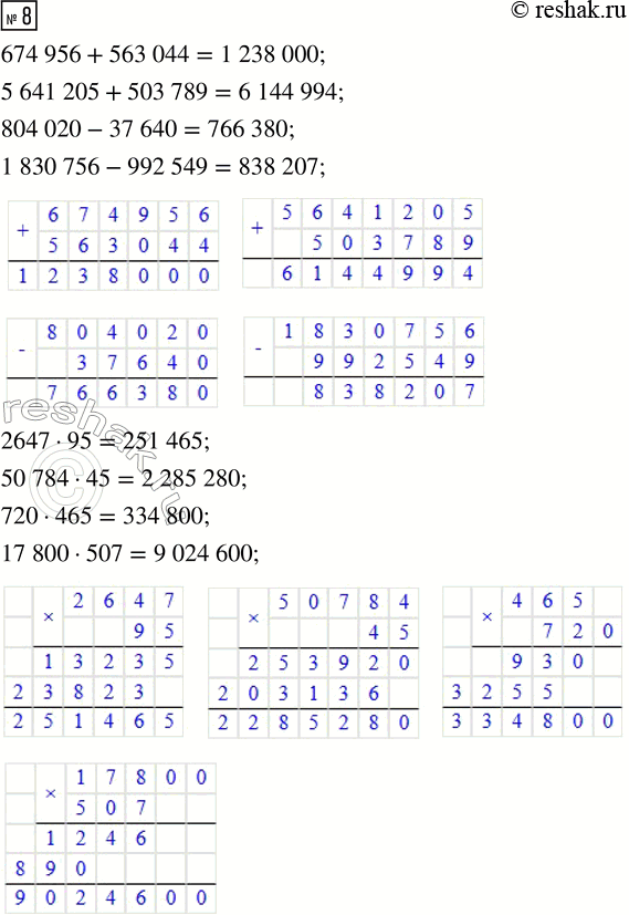 674 956 + 563 044 2647 · 95 49 084 : 28