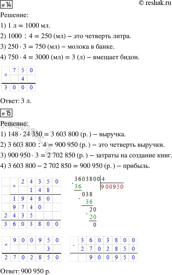 14. Банка молока вмещает три четверти литра. Четыре банки заполнили доверху бидон. Сколько литров вмещает бидон?