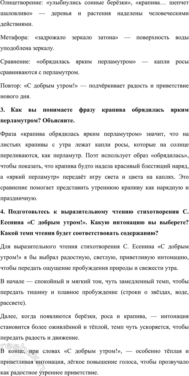 4. Подготовьтесь к выразительному чтению стихотворения С. Есенина «С добрым утром!». Какую интонацию вы выберете? Какой темп чтения будет соответствовать содержанию?