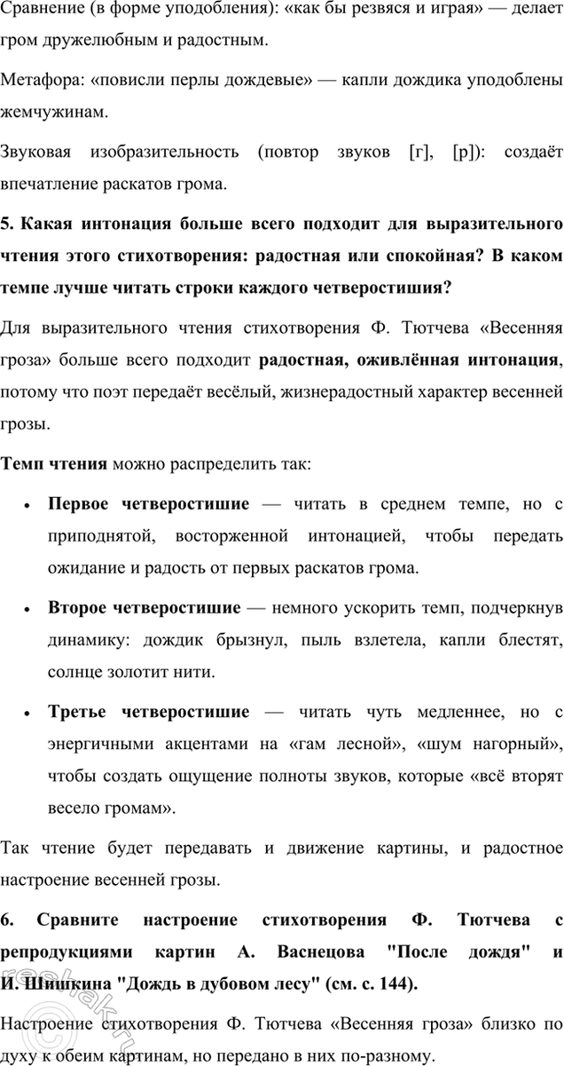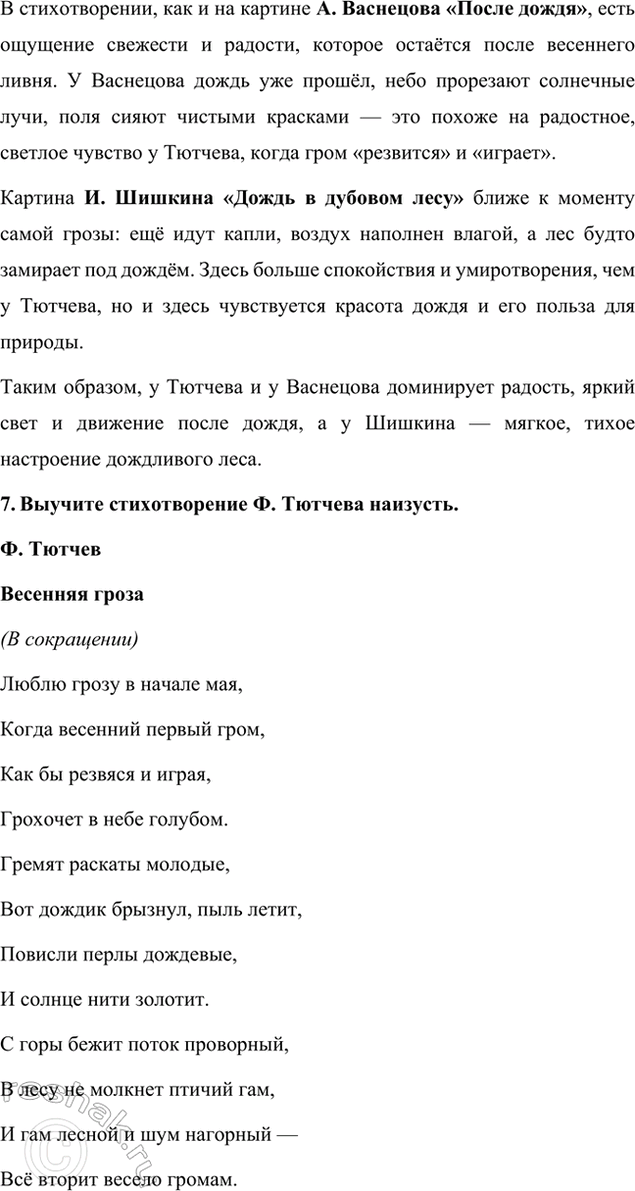 6. Сравните настроение стихотворения Ф. Тютчева с репродукциями картин А. Васнецова "После дождя" и И. Шишкина "Дождь в дубовом лесу" (см. с. 144).