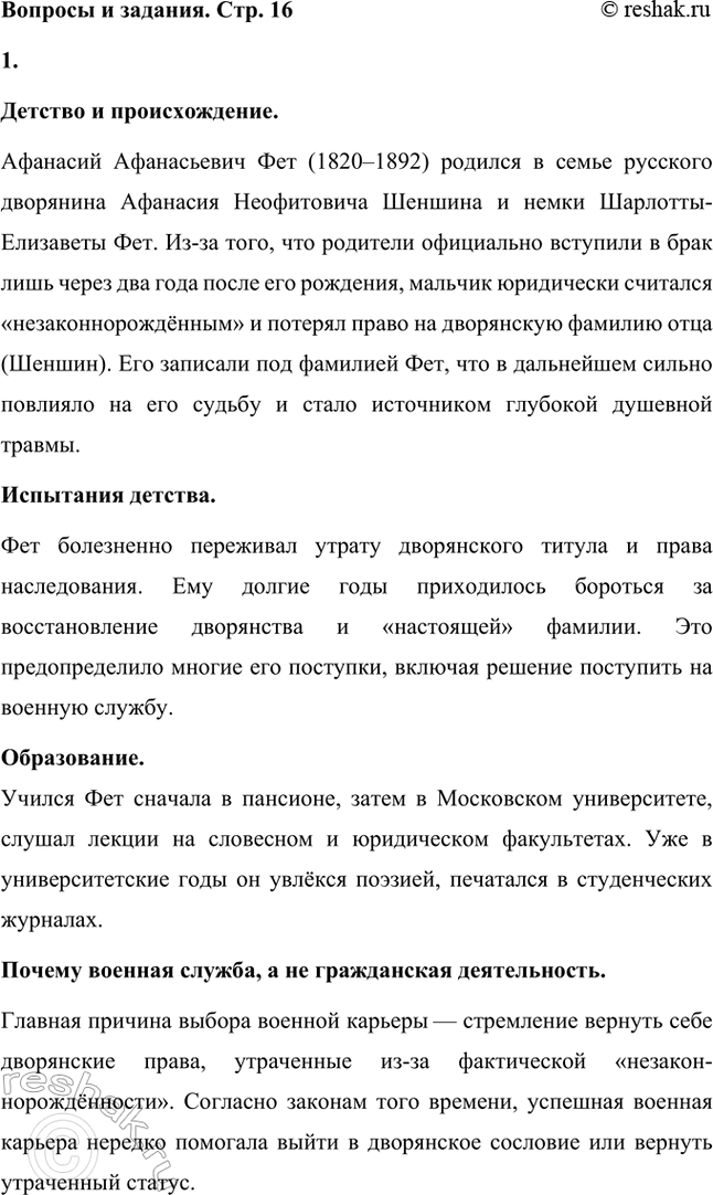 1. Расскажите о жизни А. А. Фета. Как прошло его детство? Какие испытания выпали на долю мальчика? Где он учился? Почему поэт предпочел военную службу гражданской деятельности? Почему он ставил военную службу выше поэзии?