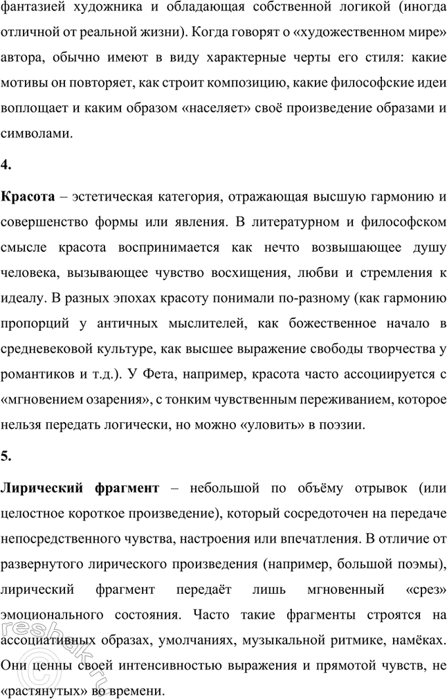 Красота – эстетическая категория, отражающая высшую гармонию и совершенство формы или явления. В литературном и философском смысле красота воспринимается как нечто возвышающее душу человека, вызывающее чувство восхищения, любви и стремления к идеалу. В разных эпохах красоту понимали по-разному (как гармонию пропорций у античных мыслителей, как божественное начало в средневековой культуре, как высшее выражение свободы творчества у романтиков и т.д.). У Фета, например, красота часто ассоциируется с «мгновением озарения», с тонким чувственным переживанием, которое нельзя передать логически, но можно «уловить» в поэзии.