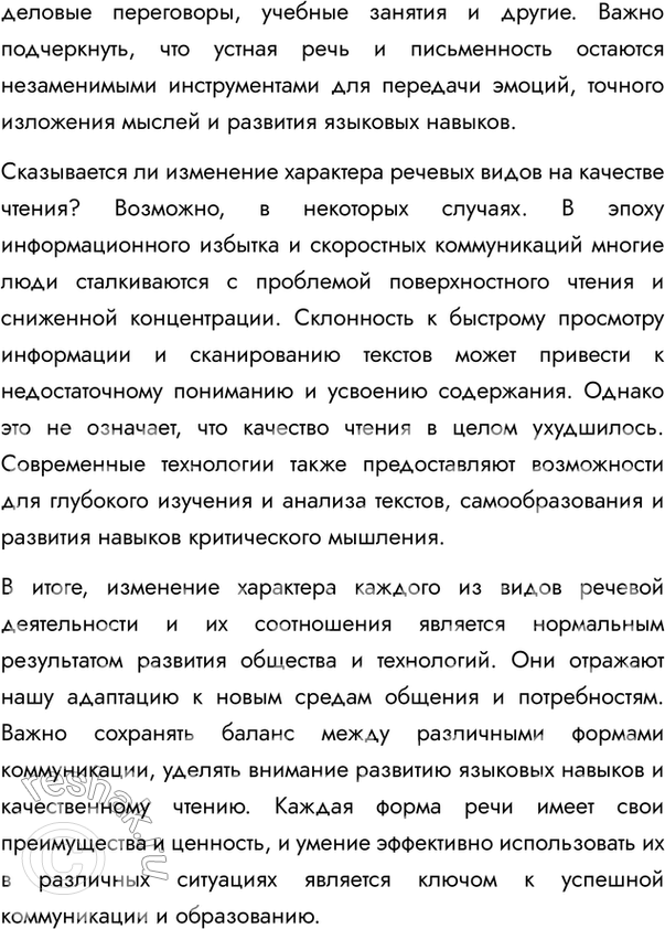 В итоге, изменение характера каждого из видов речевой деятельности и их соотношения является нормальным результатом развития общества и технологий. Они отражают нашу адаптацию к новым средам общения и потребностям. Важно сохранять баланс между различными формами коммуникации, уделять внимание развитию языковых навыков и качественному чтению. Каждая форма речи имеет свои преимущества и ценность, и умение эффективно использовать их в различных ситуациях является ключом к успешной коммуникации и образованию.