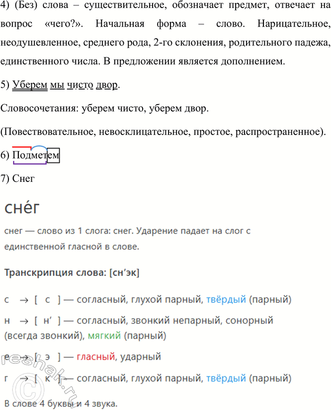 2. Вез доброго3 слова3, без тёплого слова, без нежного слова — не лечат больного. (Ю. Мориц) 3. Уберём мы чисто двор.' Подметём2 осенний сор. (В. Степанов) 4. Где-то в космосе летит голубой метеорит. (Р. Сеф) 5. Вы выходите па крыльцо. На тёмно-синем небе кое-где мигают звёзды. (И. Тургенев) б. Я жду, когда растает снег1. (М. Чехов)