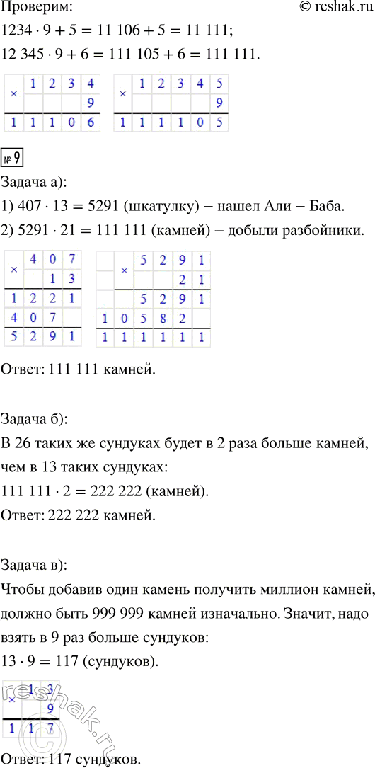 9. а) Али-Баба нашёл в пещере разбойников 13 сундуков с драгоценными камнями. В каждом сундуке 407 шкатулок, а в каждой шкатулке 21 камень. Сколько камней добыли разбойники?