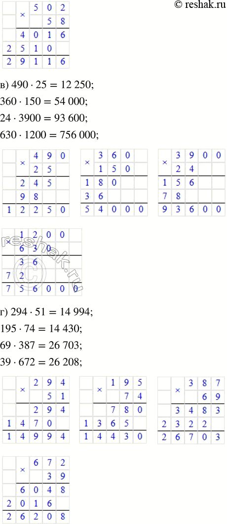 а) 43 · 57 б) 207 · 84 в) 490 · 25 г) 294 · 51