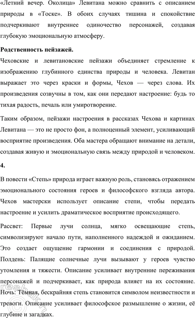 3. Другом А. П. Чехова был И. II. Левитан, которого исследователи считают возможным прототипом художника из «Дома с мезонином». Сопоставьте пейзажи в известных вам рассказах писателя с живописными полотнами художника («Март», «Озеро», «Летний вечер. Околица». «Золотая осень» и др.). Дайте определение (с опорой на текст учебника) «пейзажа настроения» и покажите родственность в этом отношении чеховских и левитановских пейзажей.