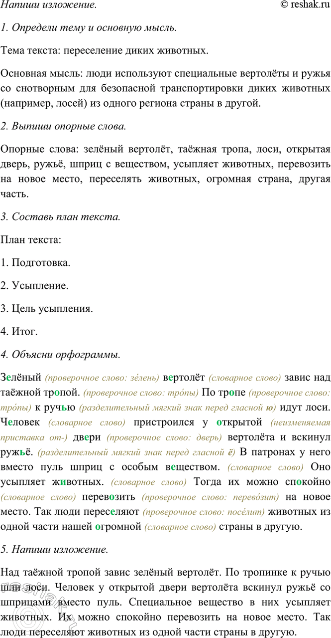 Зелёный (проверочное слово: зелень) вертолёт (словарное слово) завис над таёжной тропой. (проверочное слово: тропы) По тропе (проверочное слово: тропы) к ручью (разделительный мягкий знак перед гласной ю) идут лоси. Человек (словарное слово) пристроился у открытой (неизменяемая приставка от-) двери (проверочное слово: дверь) вертолёта и вскинул ружьё. (разделительный мягкий знак перед гласной ё) В патронах у него вместо пуль шприц с особым веществом. (словарное слово) Оно усыпляет животных. (словарное слово) Тогда их можно спокойно (словарное слово) перевозить (проверочное слово: перевозит) на новое место. Так люди переселяют (проверочное слово: поселит) животных из одной части нашей огромной (словарное слово) страны в другую.