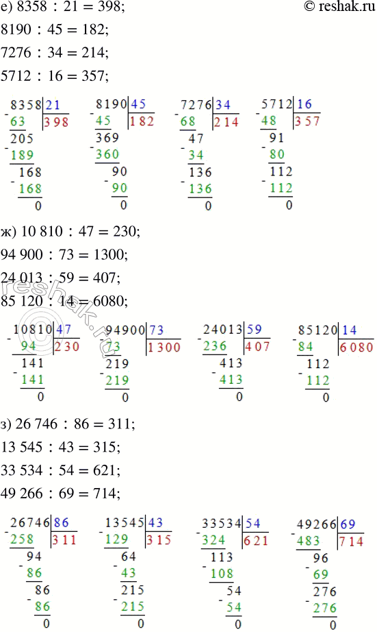 д) 7638 : 38 е) 8358 : 21 ж) 10 810 : 47 з) 26 746 : 86