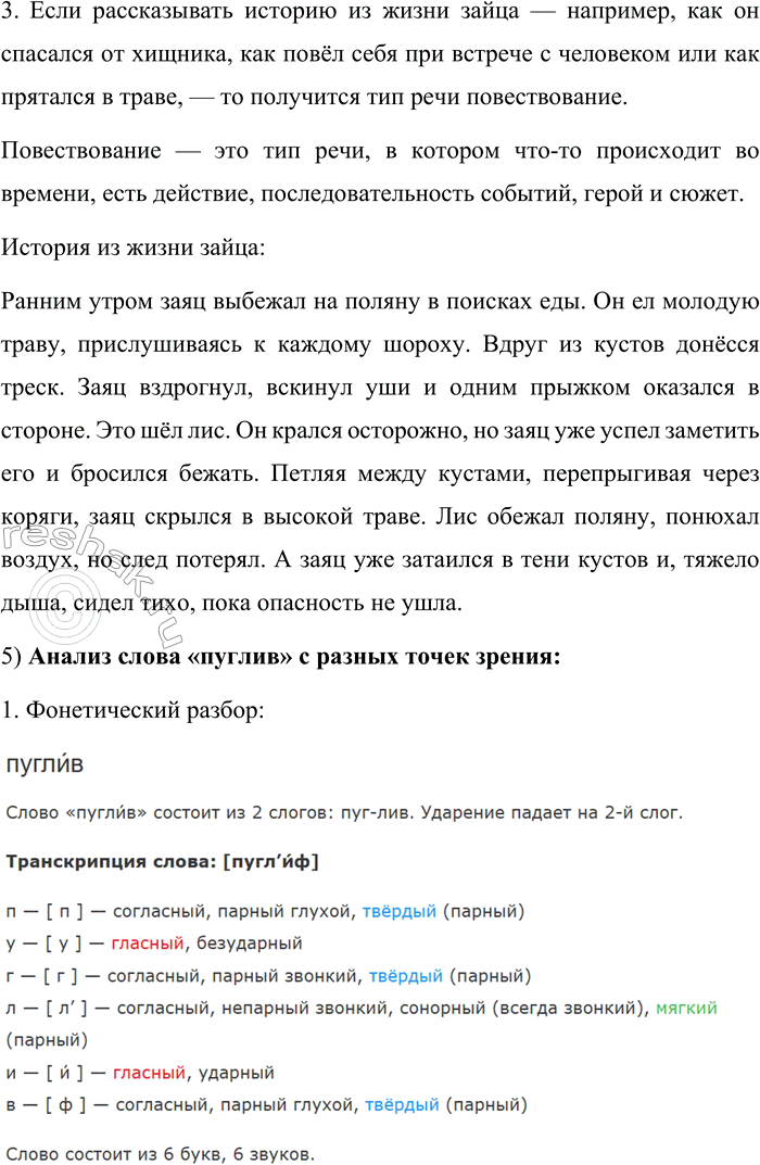3. Если рассказывать историю из жизни зайца — например, как он спасался от хищника, как повёл себя при встрече с человеком или как прятался в траве, — то получится тип речи повествование.