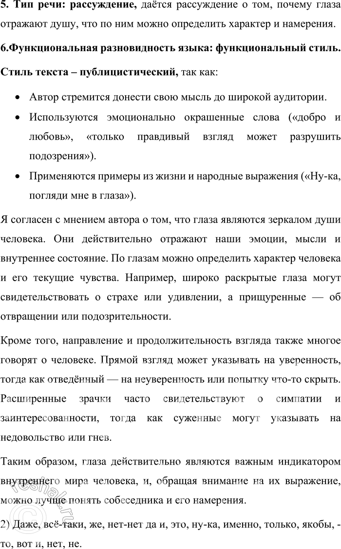 5. Тип речи: рассуждение, даётся рассуждение о том, почему глаза отражают душу, что по ним можно определить характер и намерения.