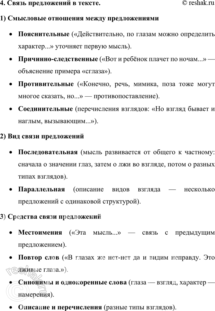 • Последовательная (мысль развивается от общего к частному: сначала о значении глаз, затем о лжи во взгляде, потом о разных типах взглядов).