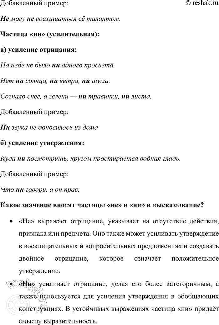 644. Устное высказывание. Внимательно рассмотрите таблицу и срав-ните её с той, что составлена вами. Какой информации не хватает в данной таблице? Спишите содержащиеся в таблице примеры и добавьте свои. Используя этот материал, кратко расскажите, какое значение вносят частицы не и ни в высказывание.