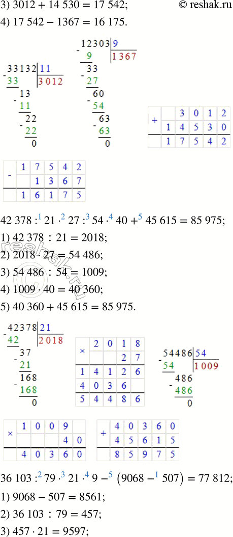 33 132 : 11 + 14 530 - 12 303 : 9 36 103 : 79 · 21 · 9 - (9068 - 507)