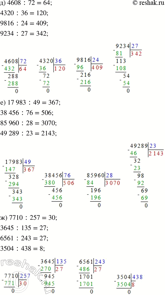 д) 4608 : 72 е) 17 983 : 49 ж) 7710 : 257 з) 34 720 : 217