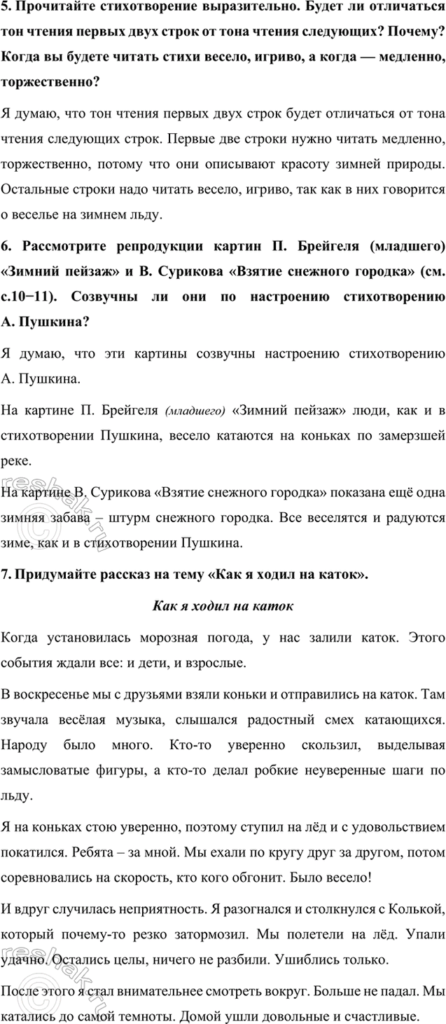 6. Рассмотрите репродукции картин П. Брейгеля (младшего) «Зимний пейзаж» и В. Сурикова «Взятие снежного городка» (см. с.10-11). Созвучны ли они по настроению стихотворению А. Пушкина?