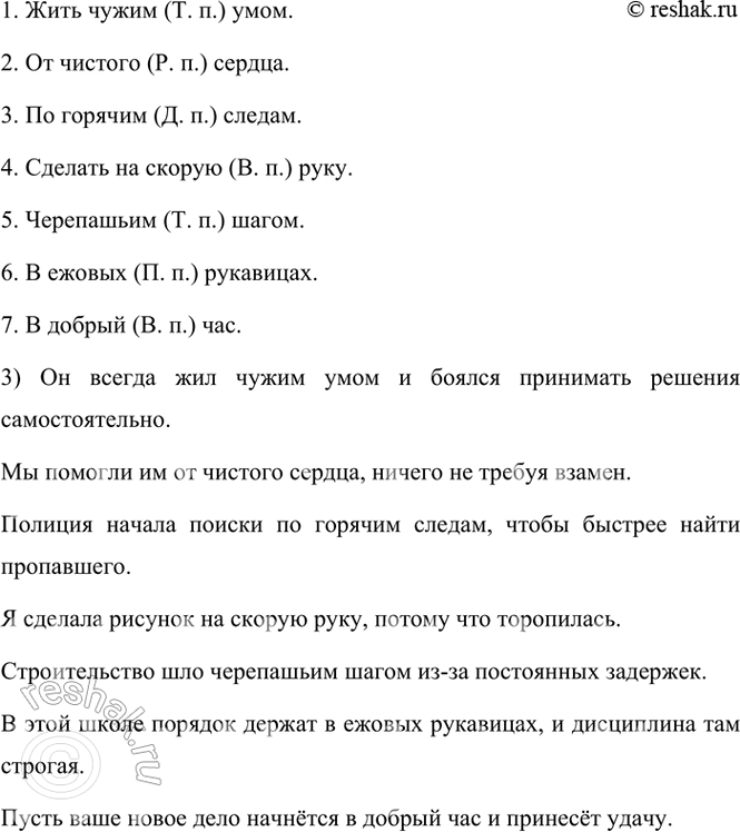 1. Жить чужим умом. 2. От чистого сердца. 3. По горячим следам. 4. Сделать на скорую руку. 5. Черепашьим шагом. 6. В ежовых рукавицах. 7. В добрый час!