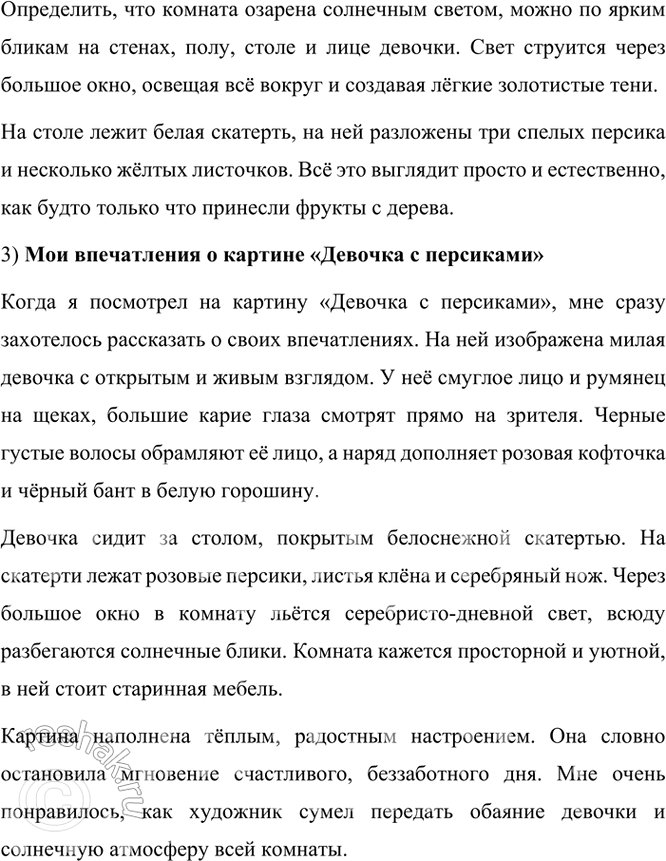 Когда я посмотрел на картину «Девочка с персиками», мне сразу захотелось рассказать о своих впечатлениях. На ней изображена милая девочка с открытым и живым взглядом. У неё смуглое лицо и румянец на щеках, большие карие глаза смотрят прямо на зрителя. Черные густые волосы обрамляют её лицо, а наряд дополняет розовая кофточка и чёрный бант в белую горошину.