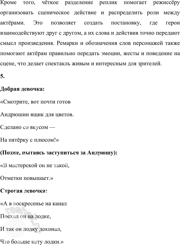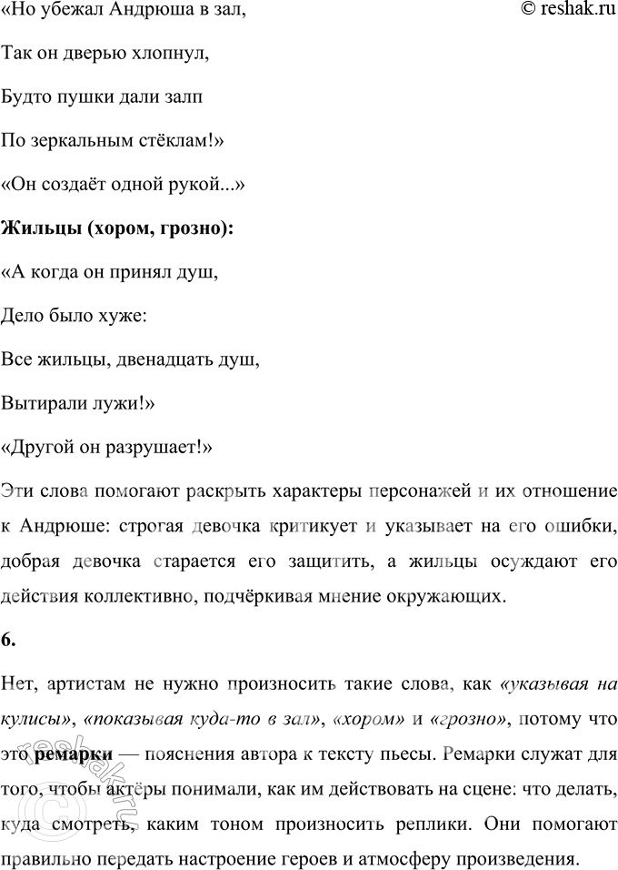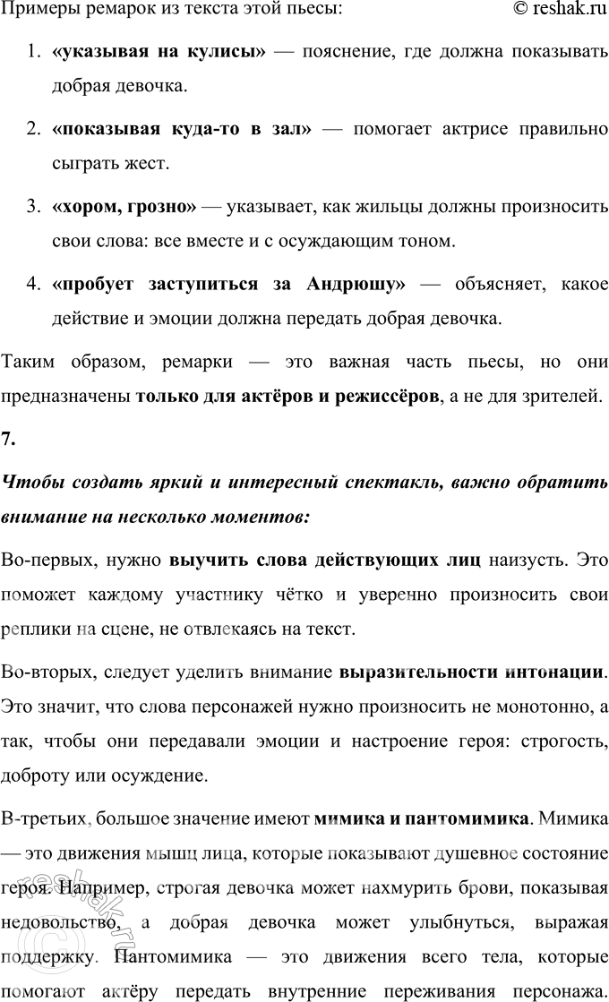 6. Как ты думаешь, нужно ли артистам во время спектакля произносить такие слова пьесы, как «указывая на кулисы»; «показывая куда-то в зал»; «хором»; «грозно»?