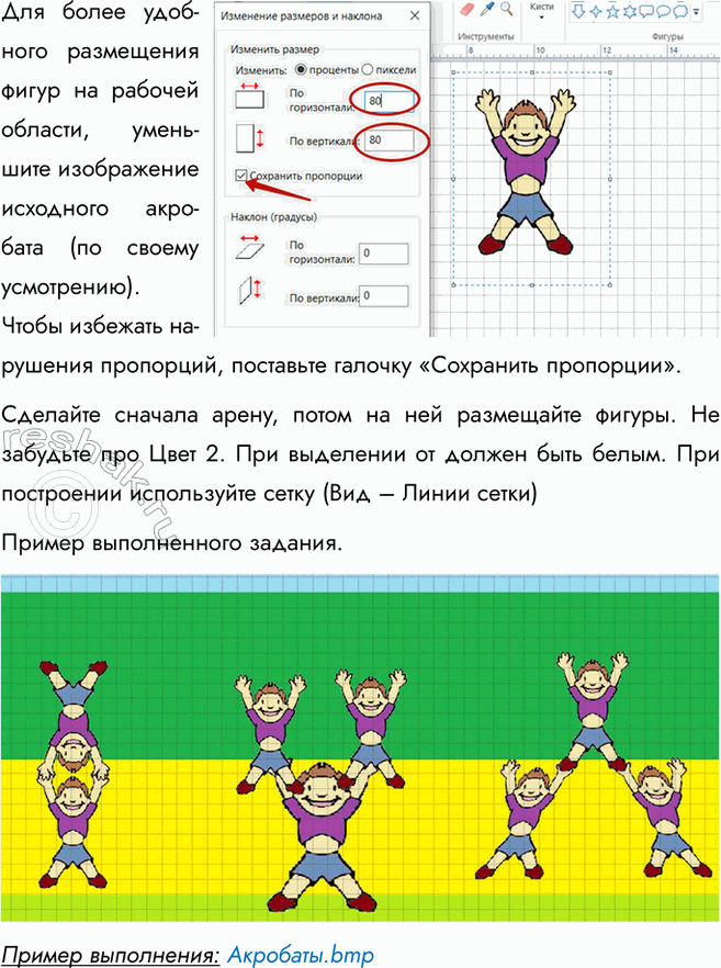 Для более удобного размещения фигур на рабочей области, уменьшите изображение исходного акробата (по своему усмотрению). Чтобы избежать на-рушения пропорций, поставьте галочку «Сохранить пропорции».