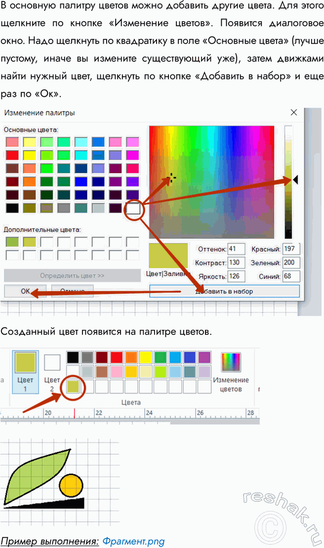 В основную палитру цветов можно добавить другие цвета. Для этого щелкните по кнопке «Изменение цветов». Появится диалоговое окно. Надо щелкнуть по квадратику в поле «Основные цвета» (лучше пустому, иначе вы измените существующий уже), затем движками найти нужный цвет, щелкнуть по кнопке «Добавить в набор» и еще раз по «Ок».