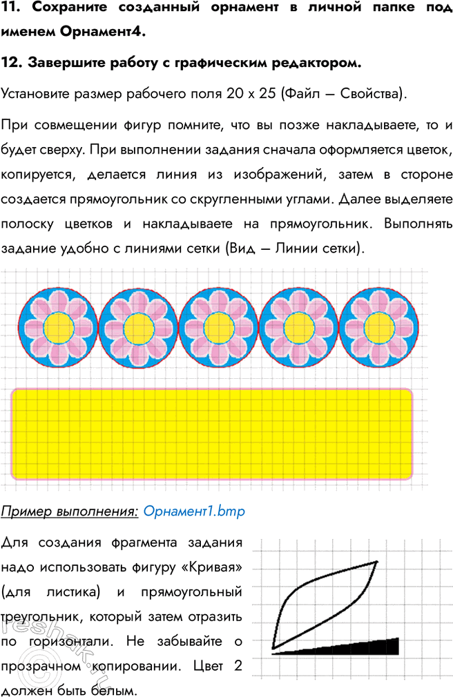 Для создания фрагмента задания надо использовать фигуру «Кривая» (для листика) и прямоугольный треугольник, который затем отразить по горизонтали. Не забывайте о прозрачном копировании. Цвет 2 должен быть белым.