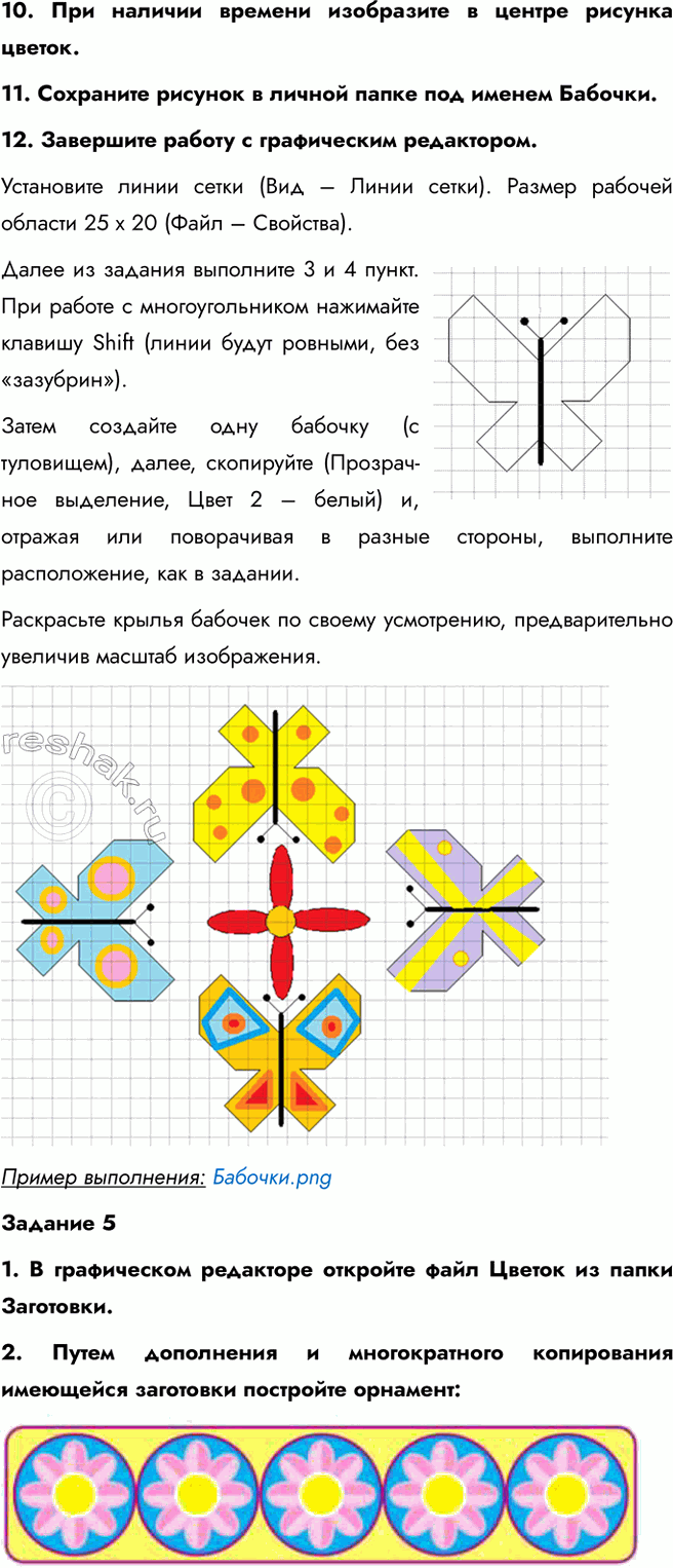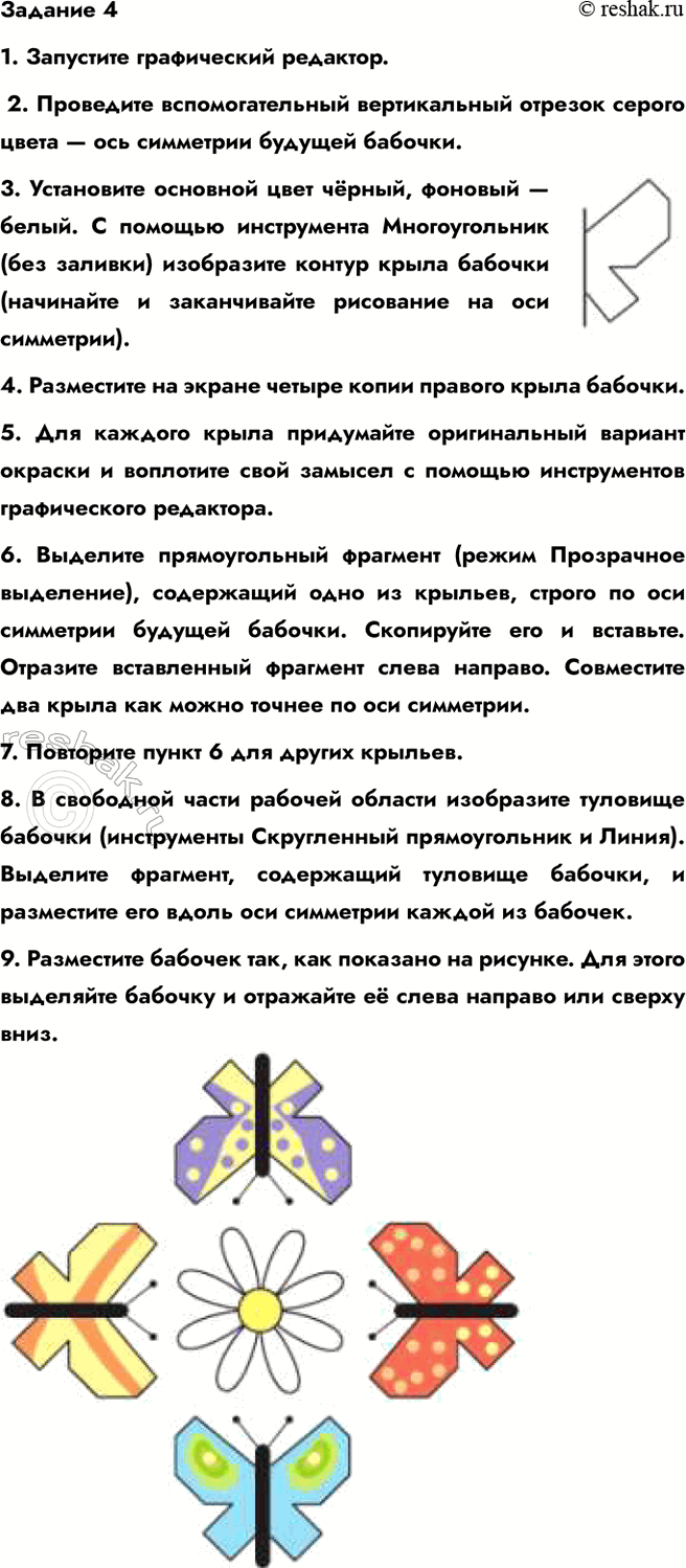 Затем создайте одну бабочку (с туловищем), далее, скопируйте (Прозрачное выделение, Цвет 2 – белый) и, отражая или поворачивая в разные стороны, выполните расположение, как в задании.