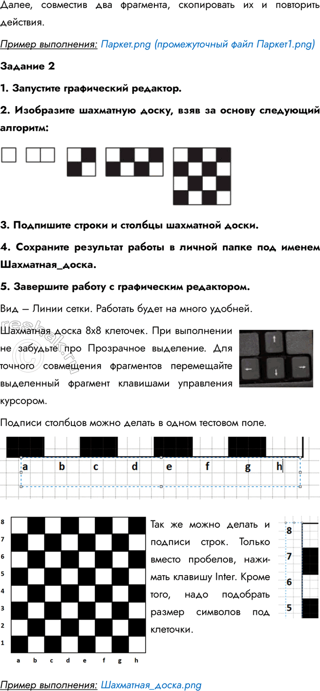 Шахматная доска 8х8 клеточек. При выполнении не забудьте про Прозрачное выделение. Для точного совмещения фрагментов перемещайте выделенный фрагмент клавишами управления курсором.