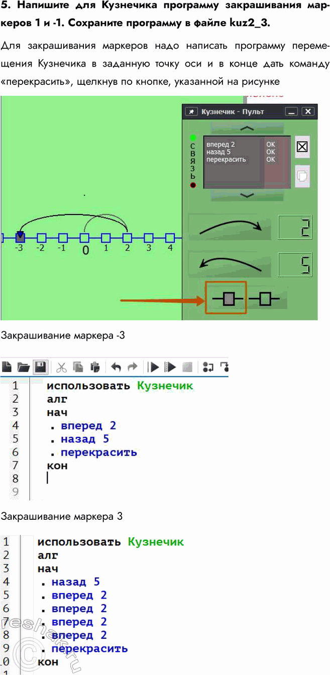 5. Напишите для Кузнечика программу закрашивания маркеров 1 и -1. Сохраните программу в файле kuz2_3.