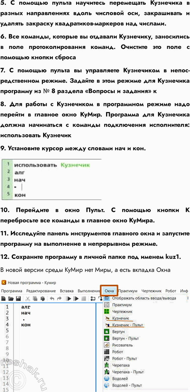 8. Для работы с Кузнечиком в программном режиме надо перейти в главное окно КуМир. Программа для Кузнечика должна начинаться с команды подключения исполнителя: использовать Кузнечик
