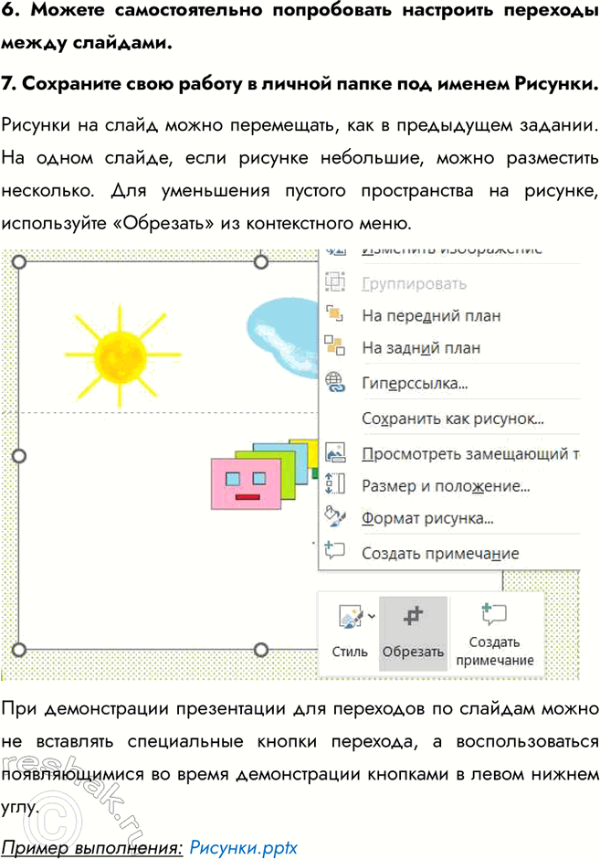 Рисунки на слайд можно перемещать, как в предыдущем задании. На одном слайде, если рисунке небольшие, можно разместить несколько. Для уменьшения пустого пространства на рисунке, используйте «Обрезать» из контекстного меню.