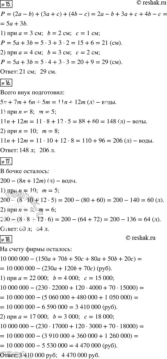 15. Имеются три мерных отрезка известных длин a, b и c. При замере с их помощью длин сторон треугольника оказалось, что стороны выражаются через мерные отрезки следующим образом: 2a-b, 3a+c и 4b-c. Составить выражение для нахождения периметра треугольника и найти значение полученного выражения, если: